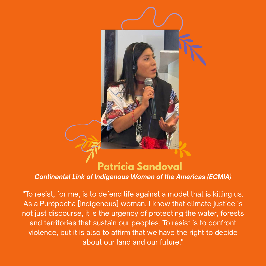 For Patricia, a Purépecha Indigenous woman (Mexico), resistance is to defend life in the face of a model that is destroying territories and directly affecting indigenous women. Climate justice, for her, is not an abstract slogan: it is the urgency of protecting the water, forests and natural resources that sustain her peoples. Resisting implies confronting extractivism, militarization and criminalization, but also affirming the right to decide on land and the collective future.
